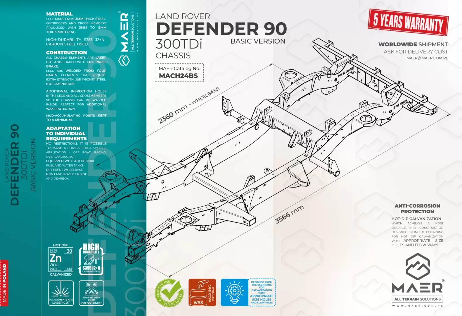 BASIC version of Land Rover Defender 90 300TDi chassis – basic level of our highest quality product supplied with the correct rear and gearbox crossmembers.
