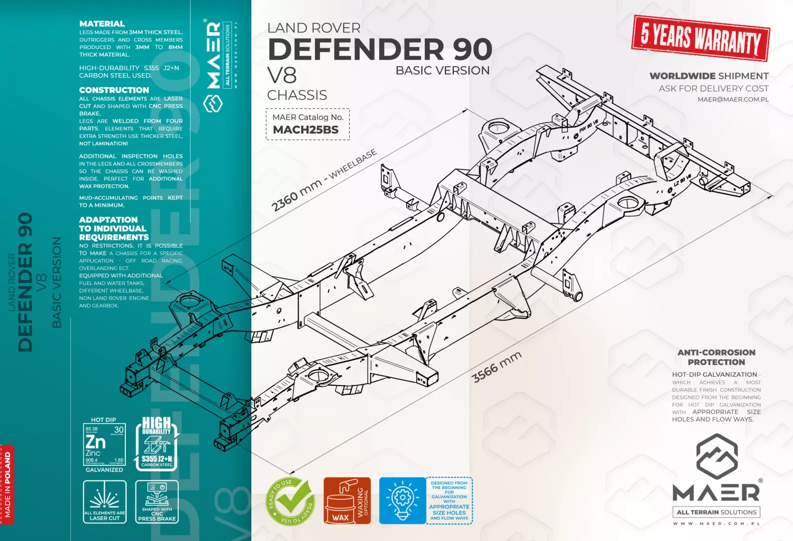 BASIC version of Land Rover Defender 90 V8 chassis – basic level of our highest quality product supplied with the correct rear and gearbox crossmembers.
